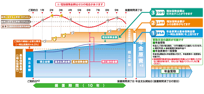 - *3年金原資とは、年金支払開始時における将来の年金をお支払いするために必要なお金のことをいいます。